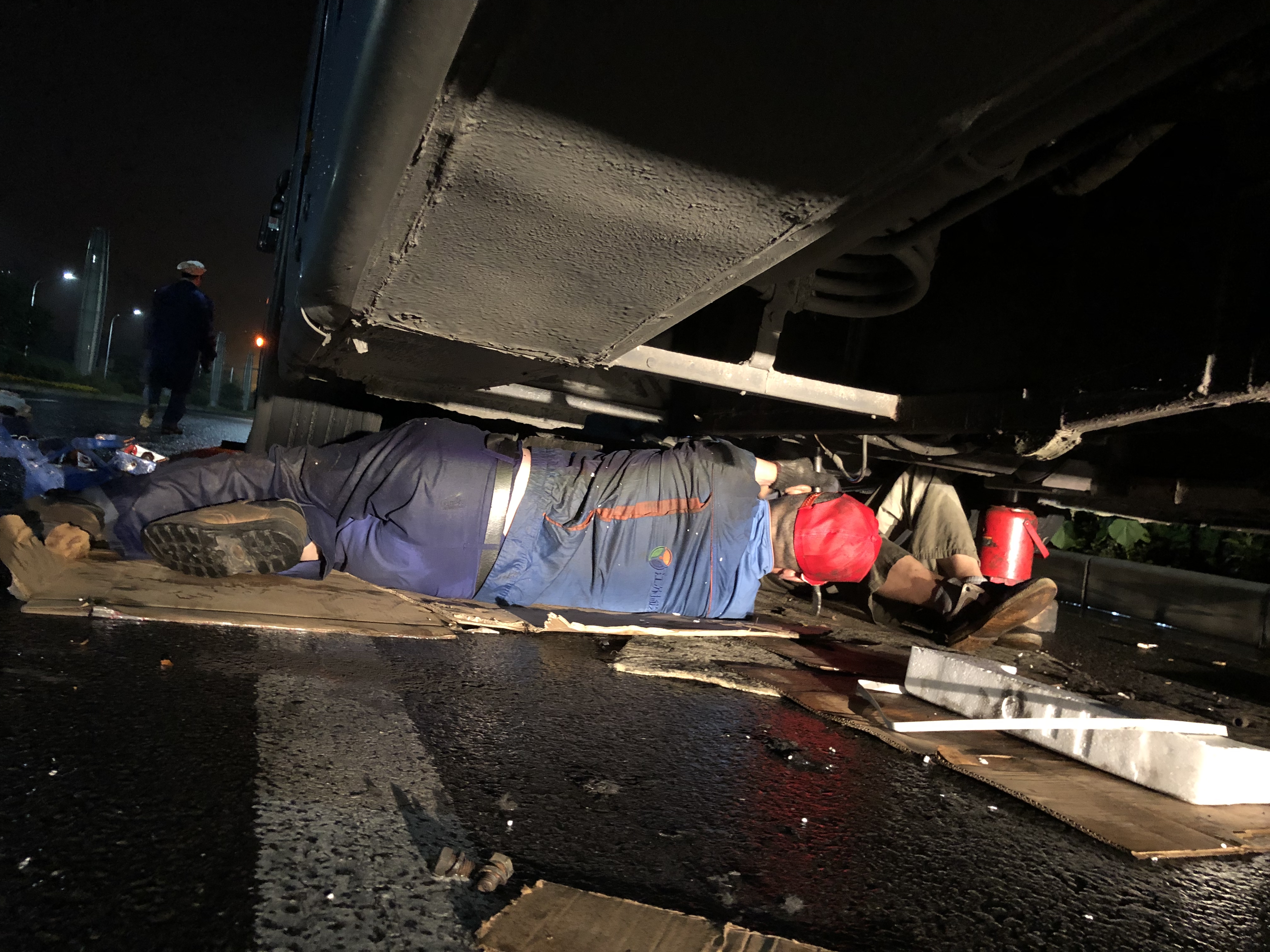 為了快速查出車輛故障,來到現(xiàn)場(chǎng)后師傅們也顧不得許多,只是簡(jiǎn)單地做了避雨防護(hù),就開始查找每一處可疑的故障,原來是離合器片磨損無法啟動(dòng),需要進(jìn)行更換。此時(shí)客服中心又聯(lián)系了在家休息的青工花兆貴,他冒雨回廠領(lǐng)取離合器三件套,再趕赴故障現(xiàn)場(chǎng)進(jìn)行安裝。由于是露天作業(yè),加之夜晚陰雨天氣,視線模糊,給維修工作帶來很大難度,但是維修師傅們團(tuán)結(jié)協(xié)作,經(jīng)過數(shù)小時(shí)的緊張搶修,故障解除,而此時(shí)搶修師傅們的衣服已經(jīng)完全濕透。