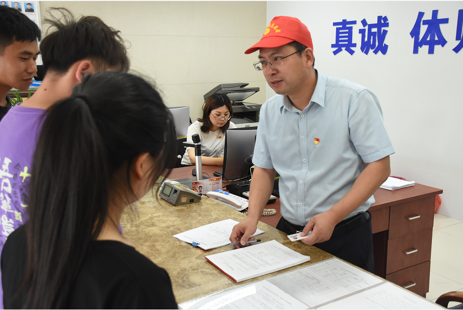 在報名大廳的服務現場,龔宇峰為前來學駕的學員登記報名信息,辦理手續(xù),并與他們交談,耐心解答他們的問題、囑咐在學習駕駛過程中需要注意的事項。