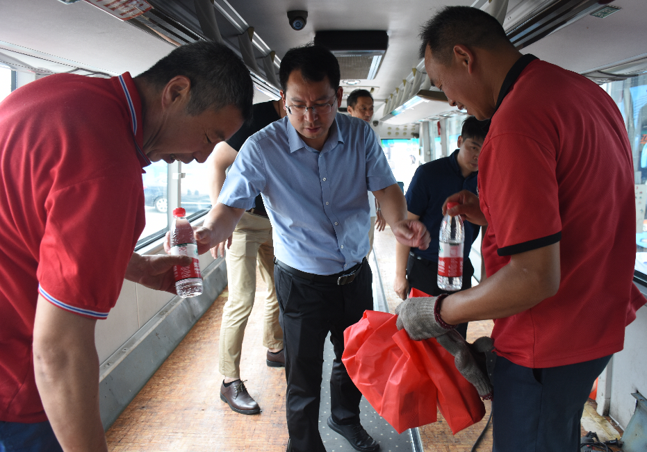 為認(rèn)真貫徹落實(shí)習(xí)近平總書記關(guān)于安全生產(chǎn)工作的重要指示精神,扎實(shí)做好夏季安全生產(chǎn)工作,保障廣大職工在生產(chǎn)過程中的安全和健康,7月22日中午,市交通產(chǎn)業(yè)集團(tuán)副總經(jīng)理、揚(yáng)汽集團(tuán)黨委書記、董事長(zhǎng)龔宇峰利用午休時(shí)間到修理廠,對(duì)奮戰(zhàn)在高溫一線,加班加點(diǎn)趕制新冠疫苗接種服務(wù)車的職工進(jìn)行慰問。