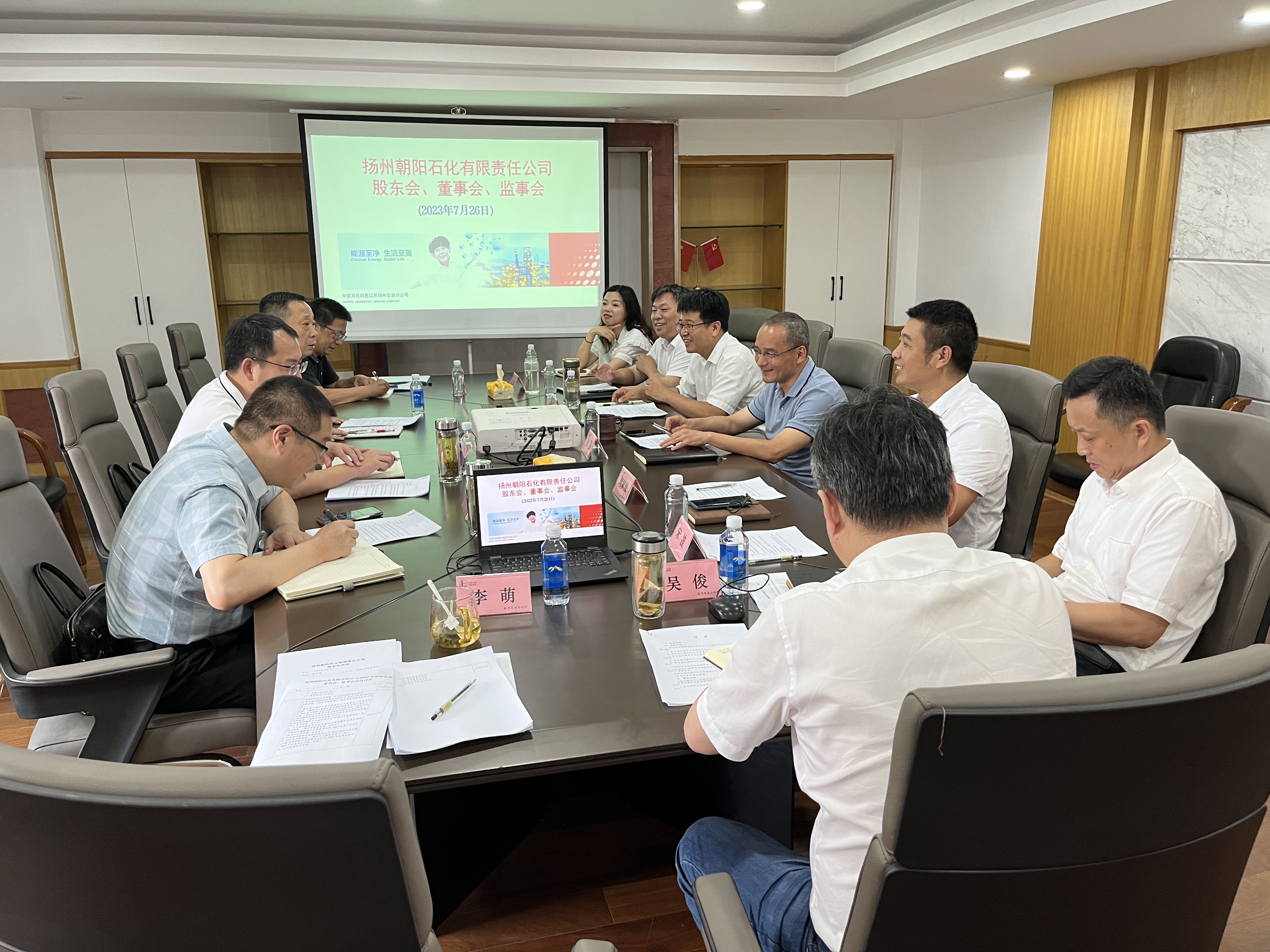 7月26日,揚(yáng)州朝陽石化有限責(zé)任公司及其股東單位中石化江蘇揚(yáng)州石油分公司、揚(yáng)汽集團(tuán)在中石化江蘇揚(yáng)州石油分公司313會(huì)議室召開了揚(yáng)州朝陽石化有限責(zé)任公司2023年度股東會(huì)、董事會(huì)、監(jiān)事會(huì)。其股東方代表市交通產(chǎn)業(yè)集團(tuán)副總經(jīng)理、揚(yáng)汽集團(tuán)黨委書記、董事長龔宇峰,揚(yáng)汽集團(tuán)副總經(jīng)理孫華出席會(huì)議。
