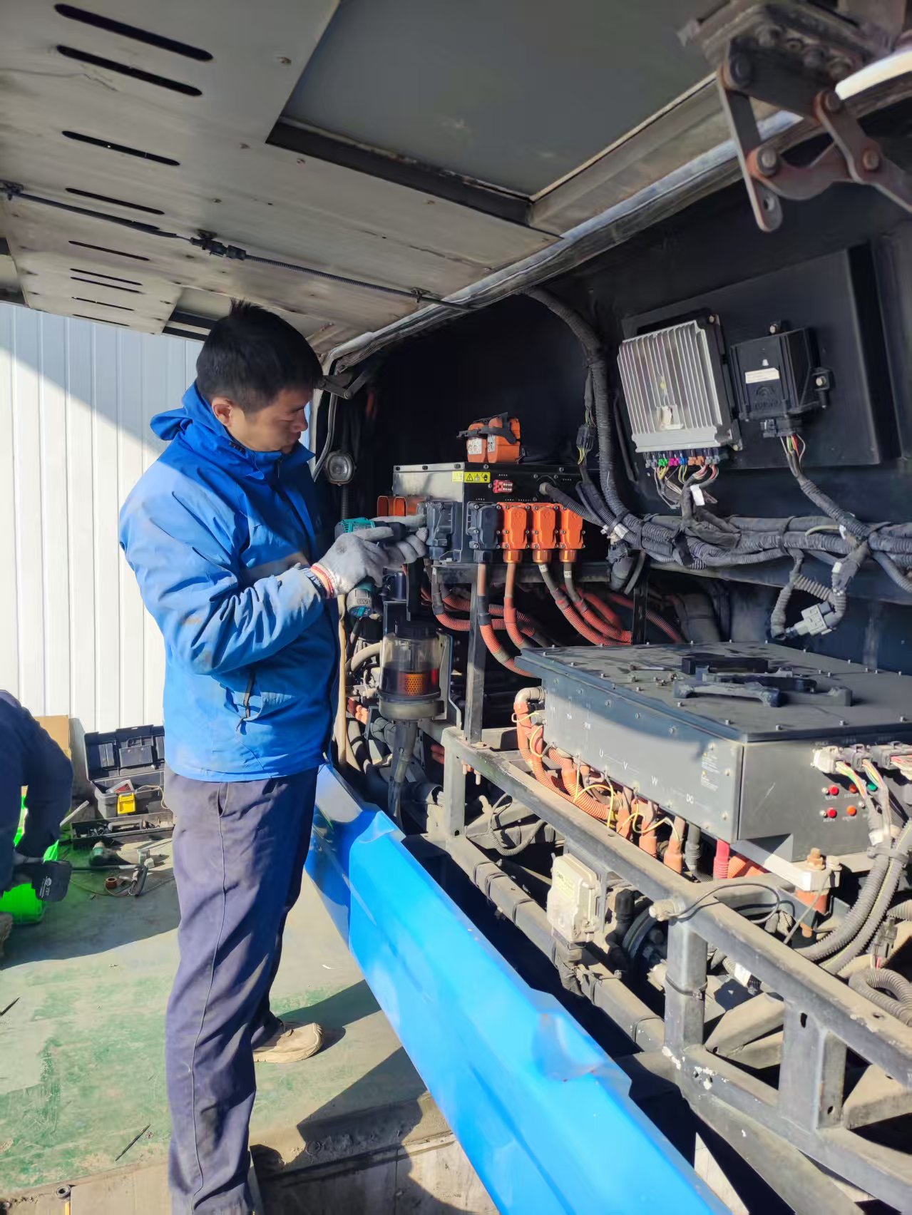 任務(wù)執(zhí)行期間,團隊克服了異地作業(yè)環(huán)境復(fù)雜、設(shè)備適配等多重實際困難,黨員同志始終沖鋒在前,帶領(lǐng)技術(shù)團隊優(yōu)化工序、協(xié)同配合,在保障作業(yè)安全與質(zhì)量的前提下,全力壓縮工期,高效完成車輛換電,確保車輛按時恢復(fù)運營。過程中,團隊還圍繞操作規(guī)范、電池維保等內(nèi)容,與當?shù)丶夹g(shù)人員開展了務(wù)實交流,助力提升區(qū)域運維能力。